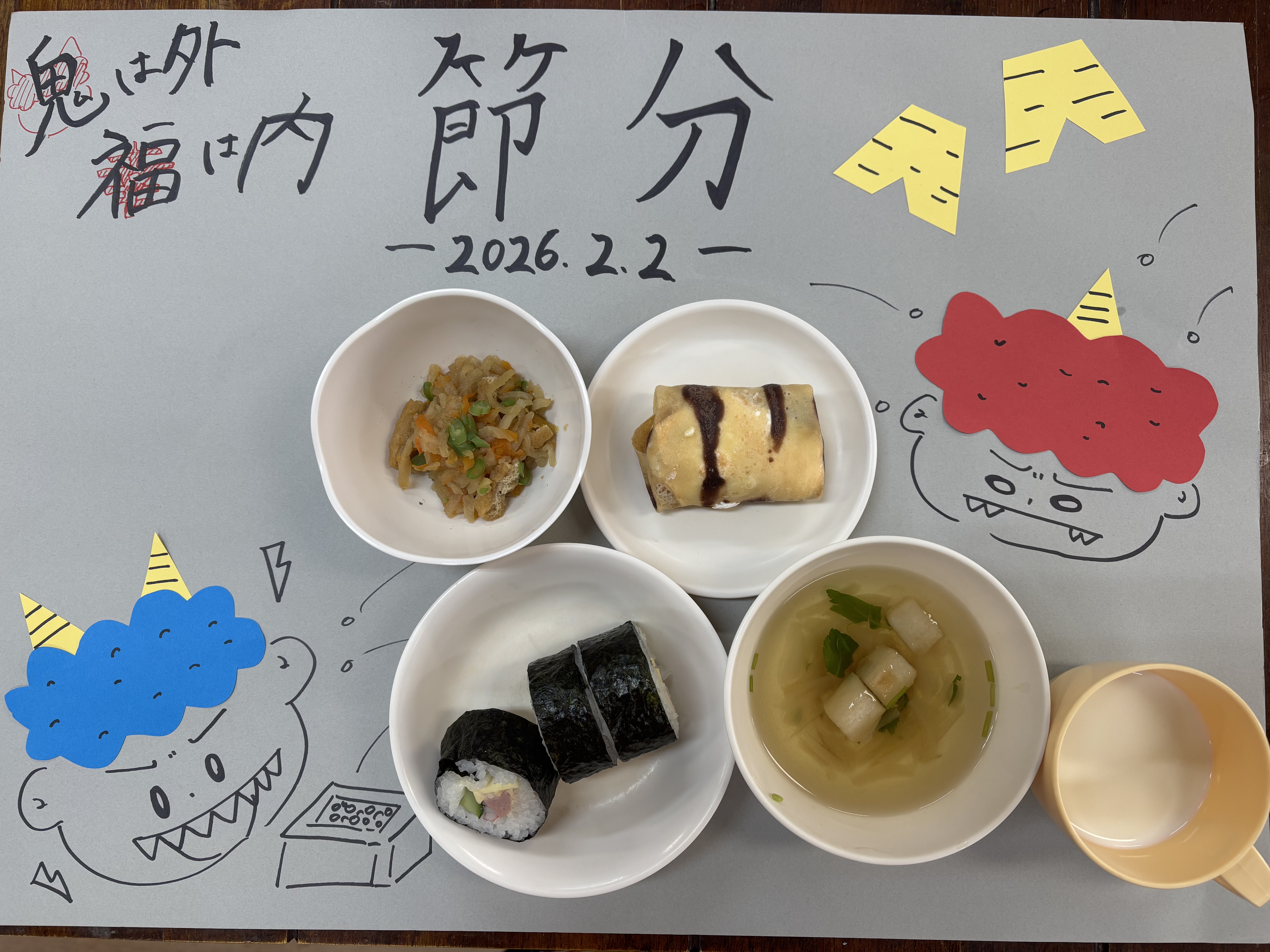 今日持ち帰った子どもたちの鬼のお面!ぜひ明日おうちでの豆まきに使用してあげて下さいね★★★