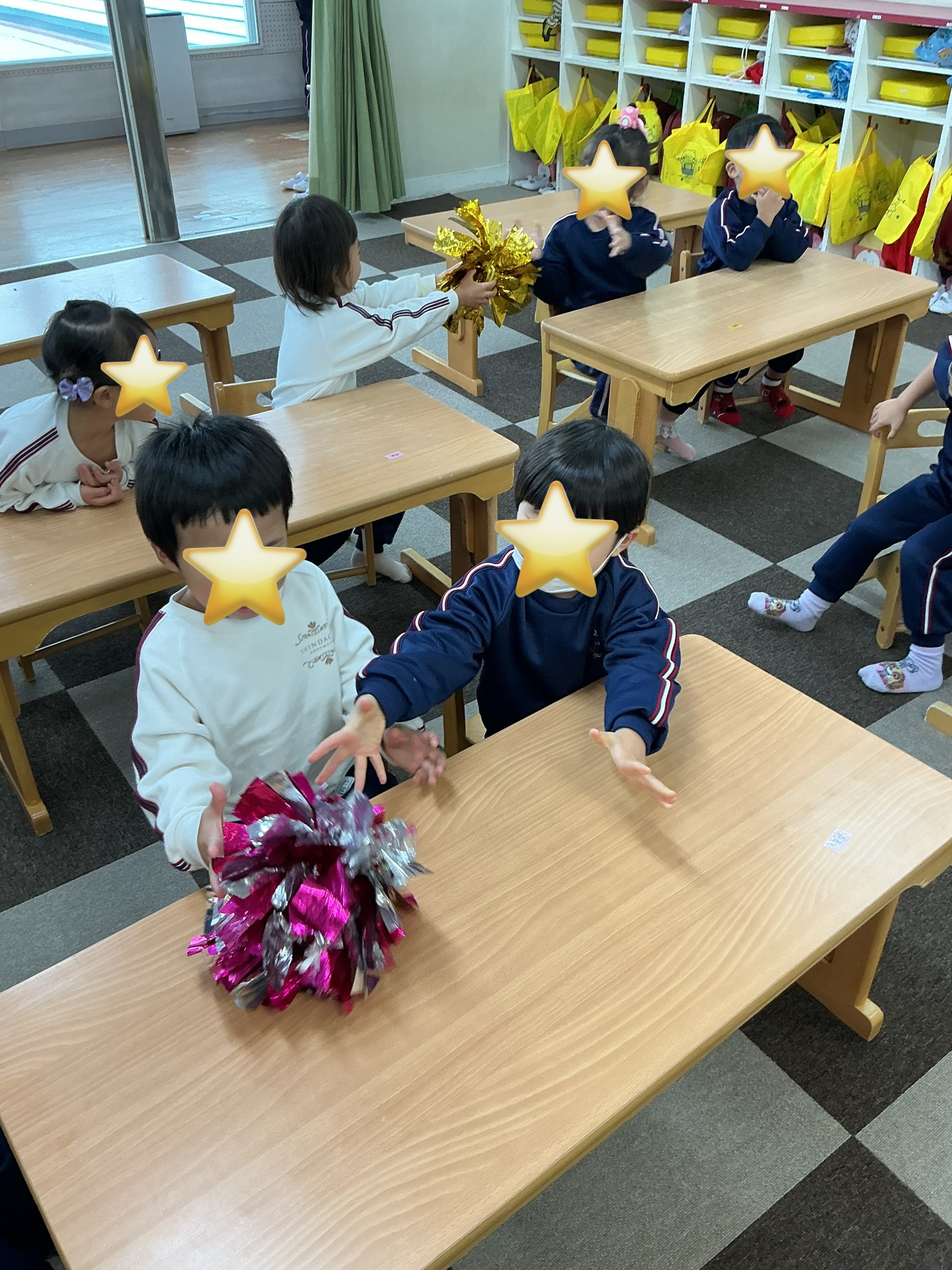 今日はあいにくの雨で園庭に出ることができなかったので、お部屋でポンポンゲームをして遊びました。