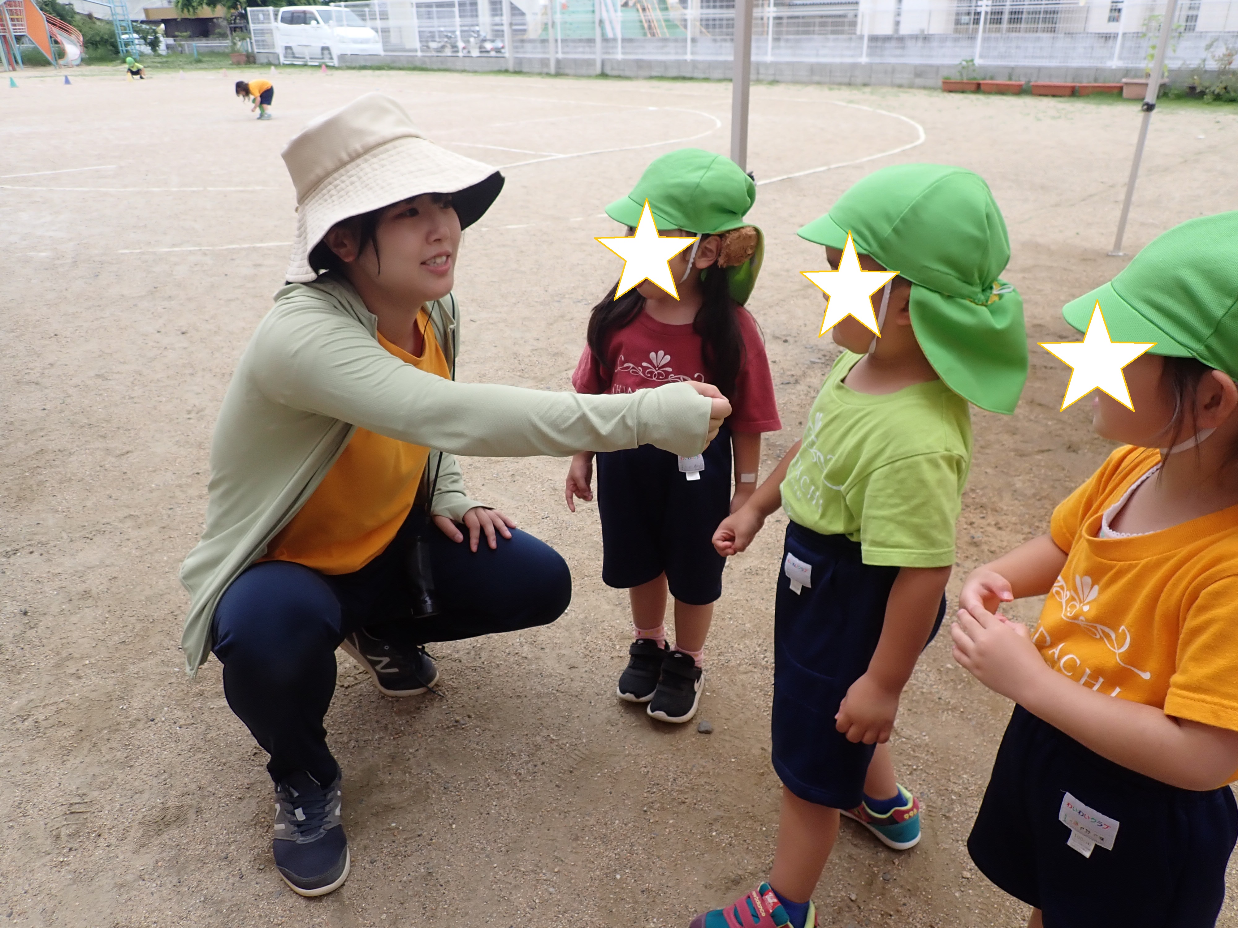 「どうやって最後まで逃げ切れたの?」とインタビューしてみるとNAちゃんは「こうやって走るんだよ!」と園庭をぐるっと遠くまで走って見本を見せてくれました☺
