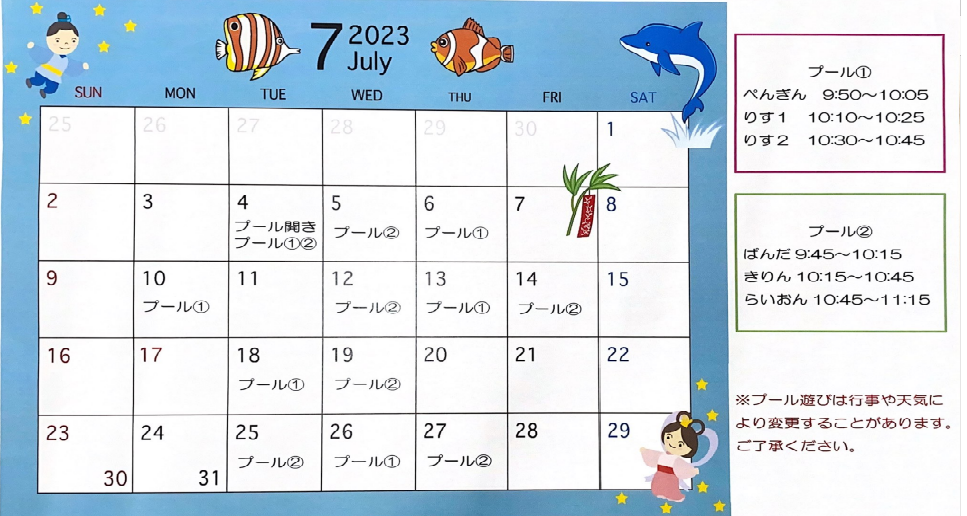 今年のプール遊びは下記の通りのスケジュールの通りとなっております。