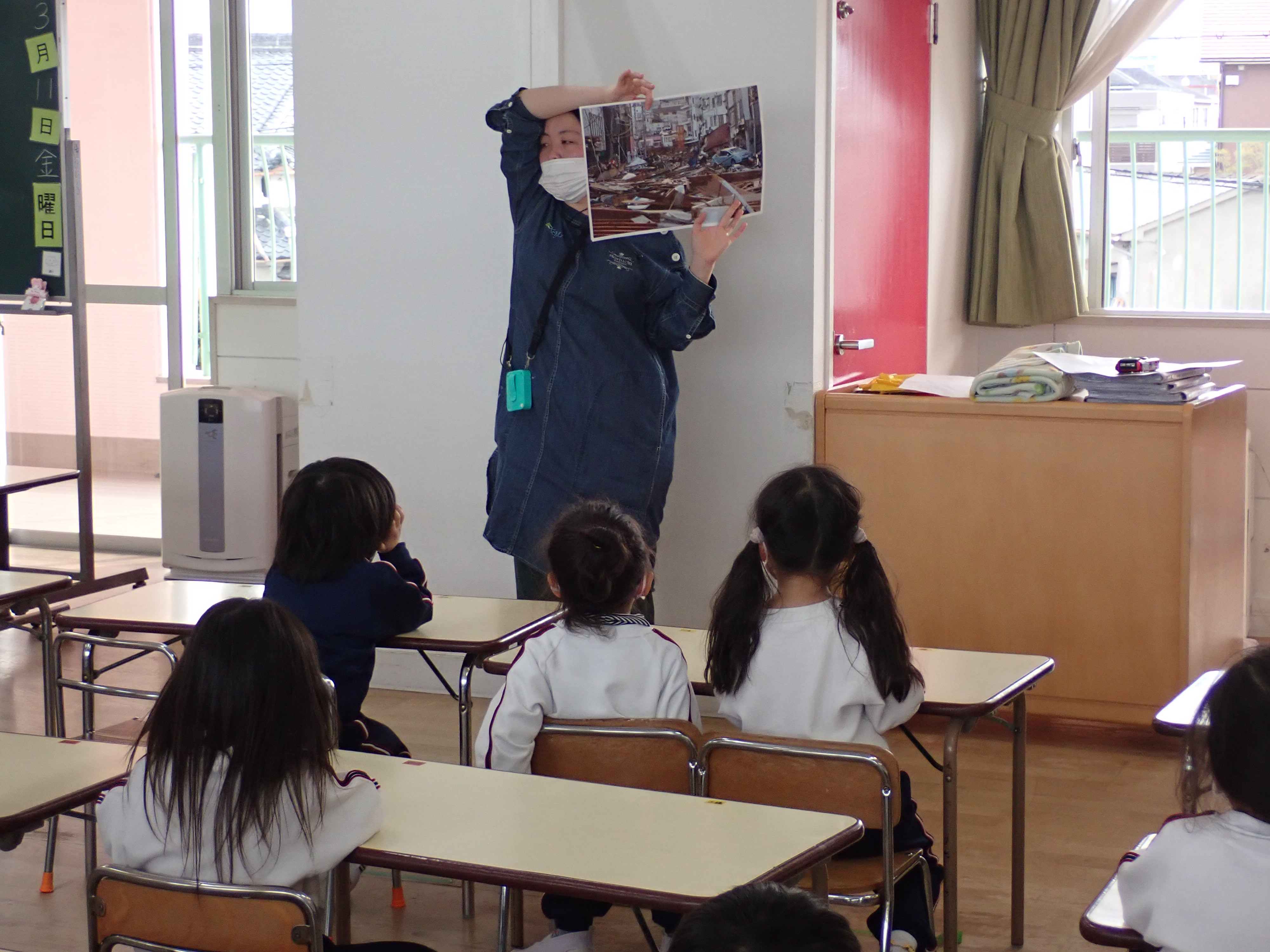 実際の写真を見せると子どもたちは驚いて「海がここまで来たん?」「ぐちゃぐちゃになってる…」と衝撃を受けていました。