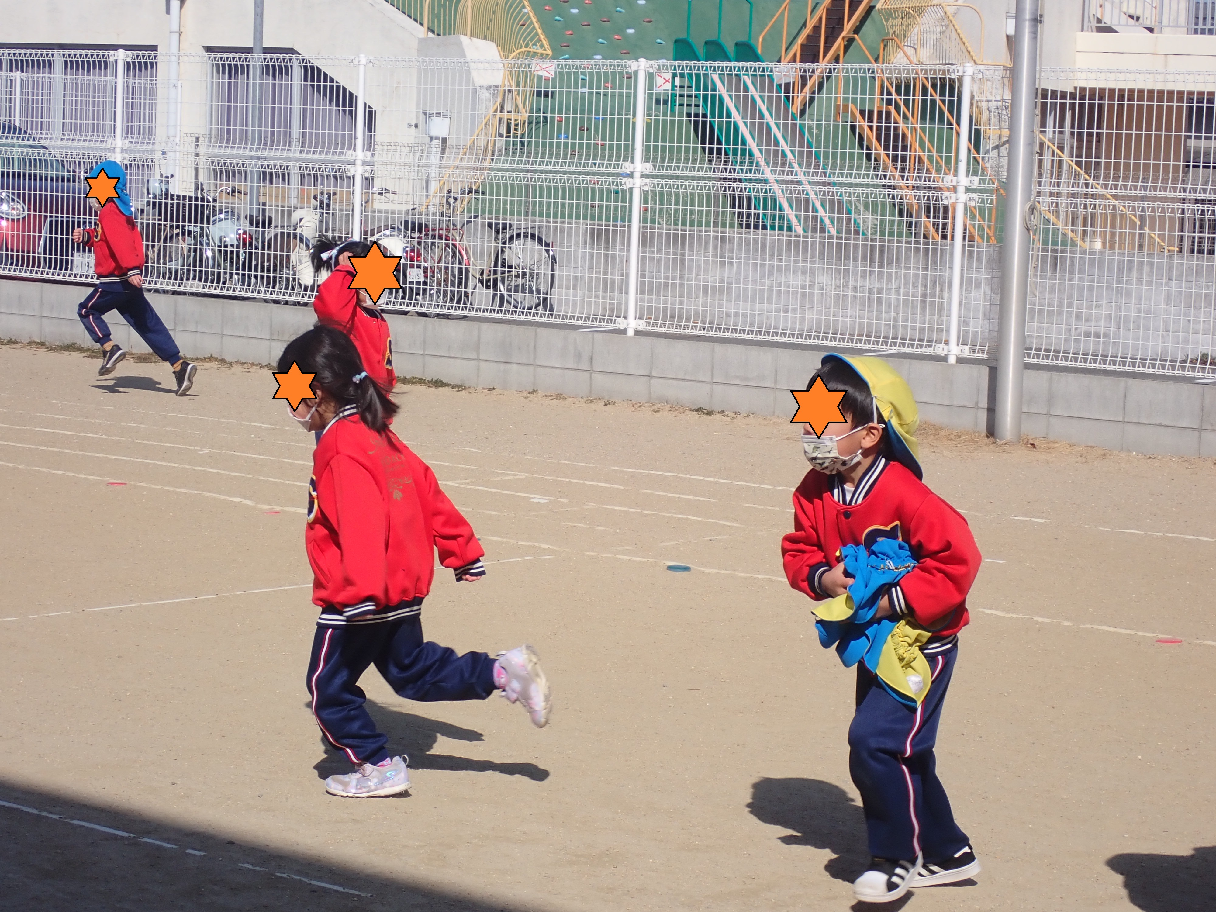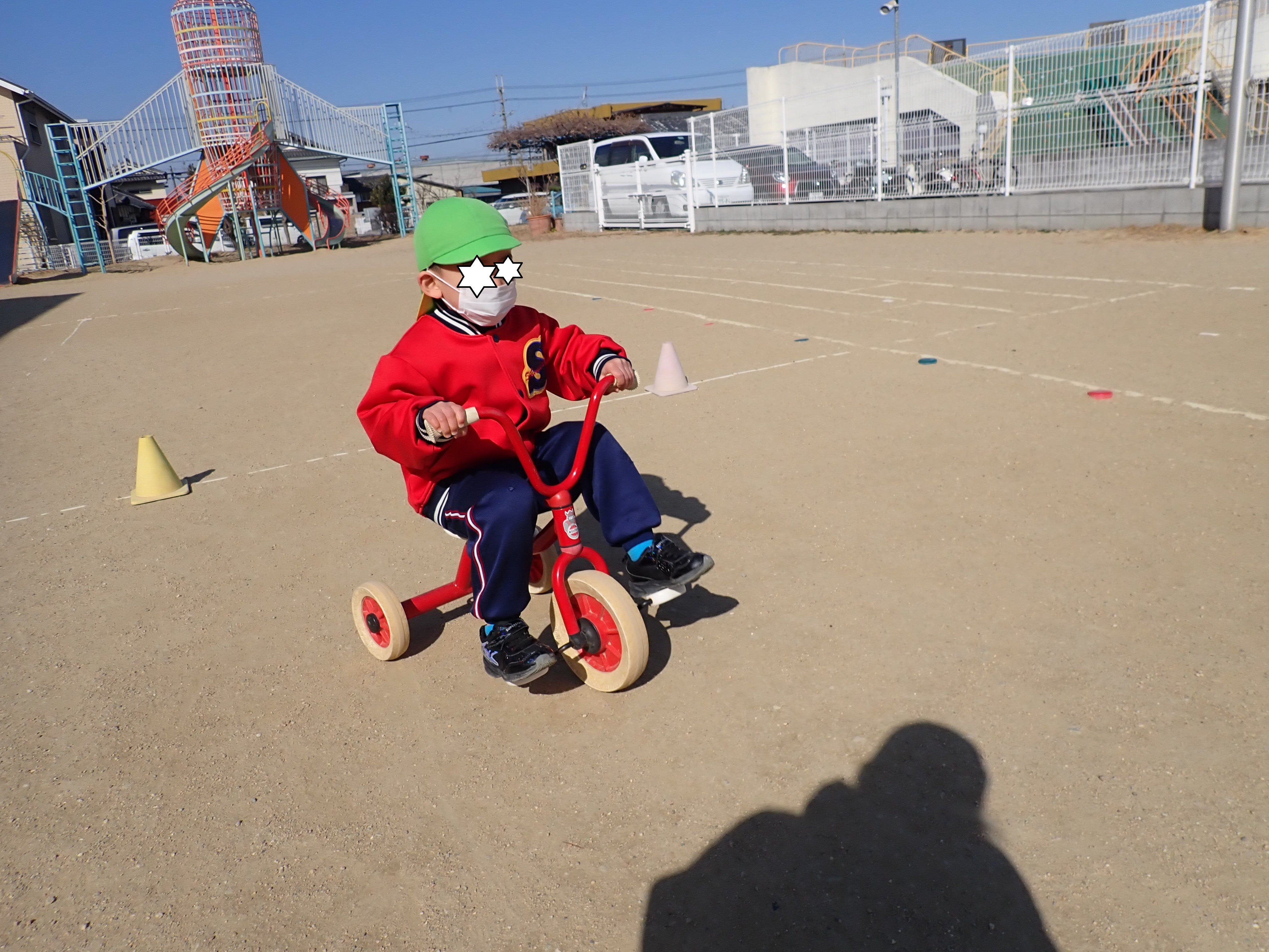 今日は黄色、赤、白、緑チームで三輪車競争をしました!