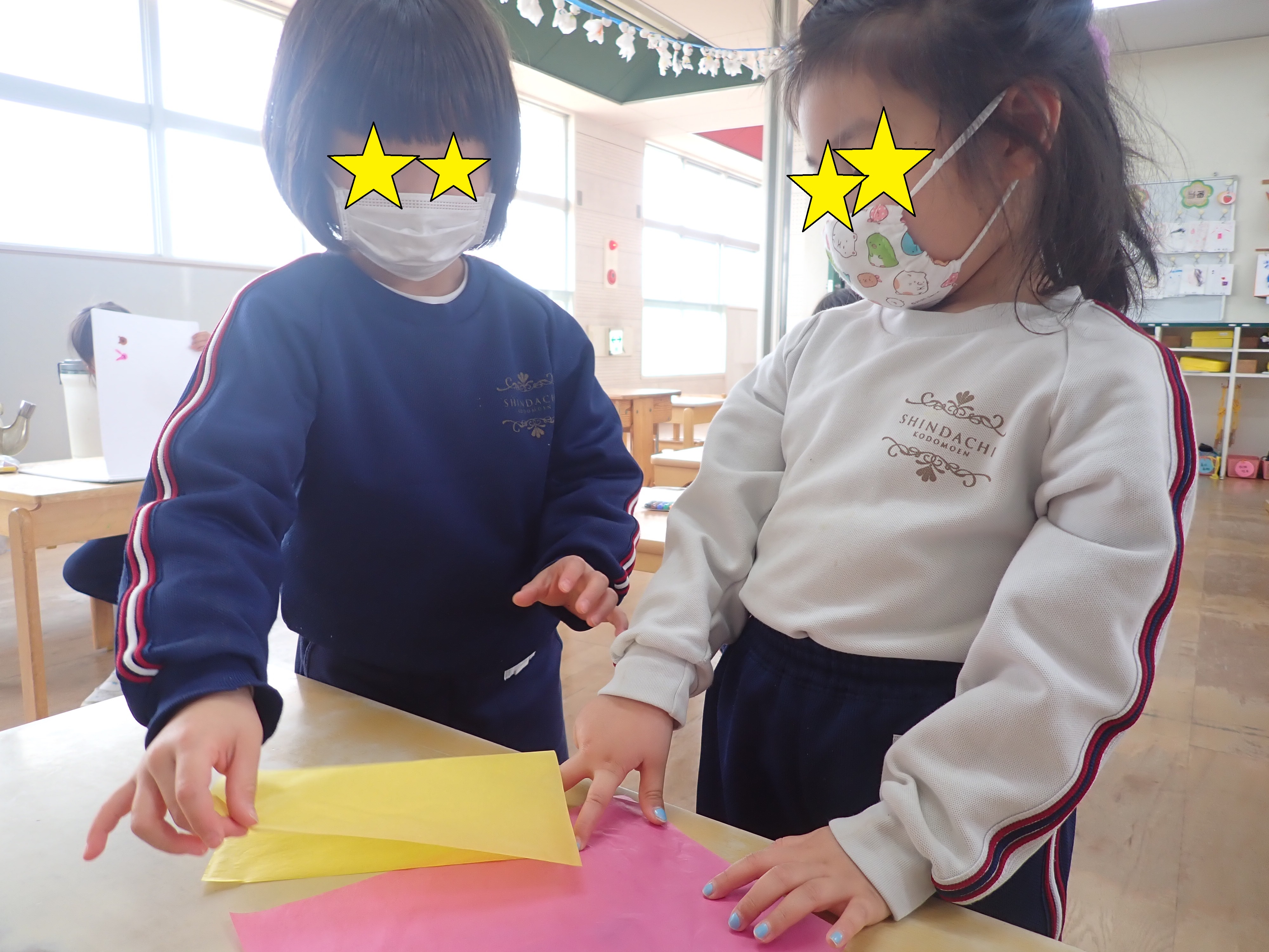 「できない~わからない~」と折り紙が難しく困っているIH君にKM君が教えに行ってあげていました。