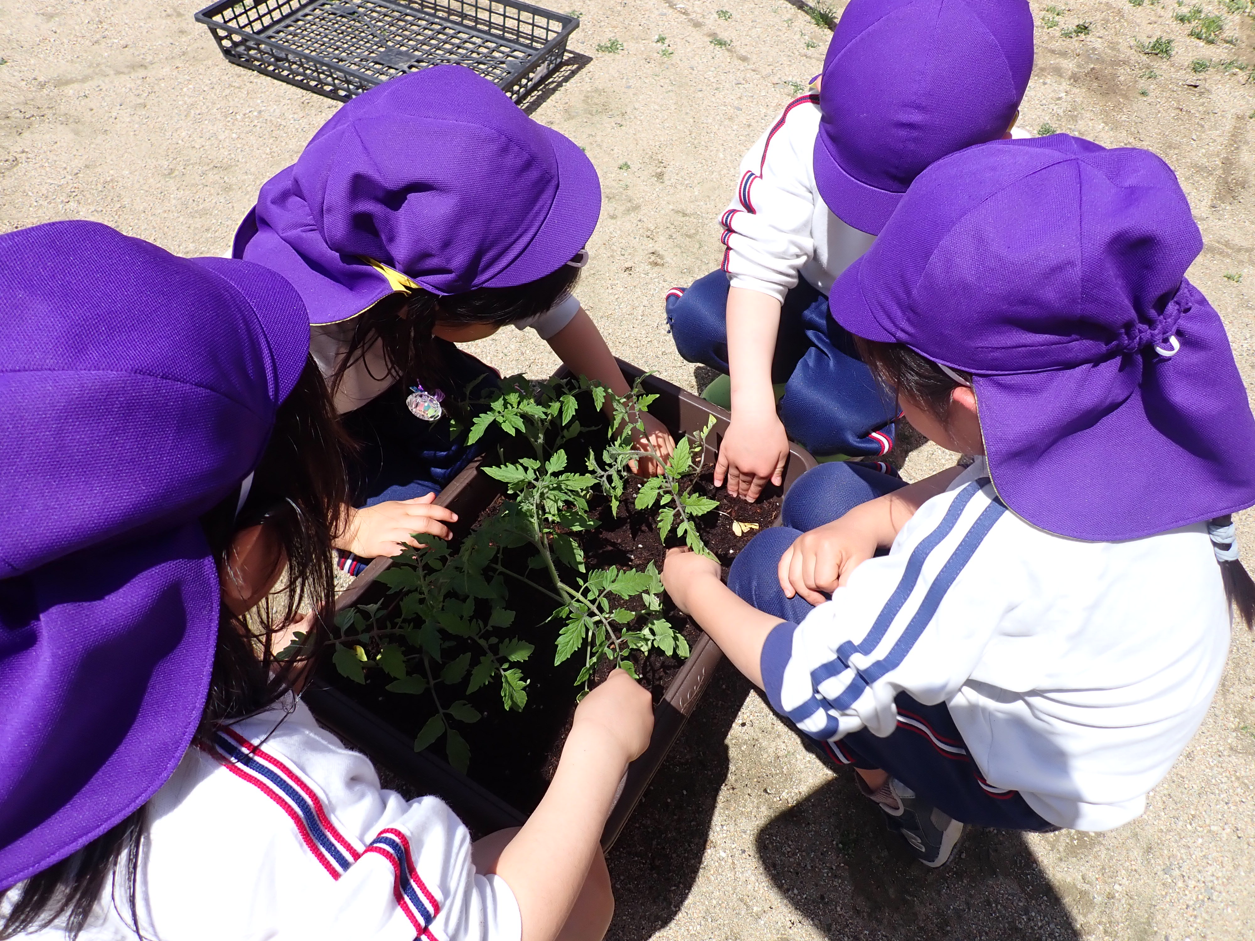 トマトとピーマンの苗の葉っぱが違うことに気付いたAEくんは「みて!!葉っぱ違うで!!凄いな」と、友だちと発見した喜びを共有していました♡
