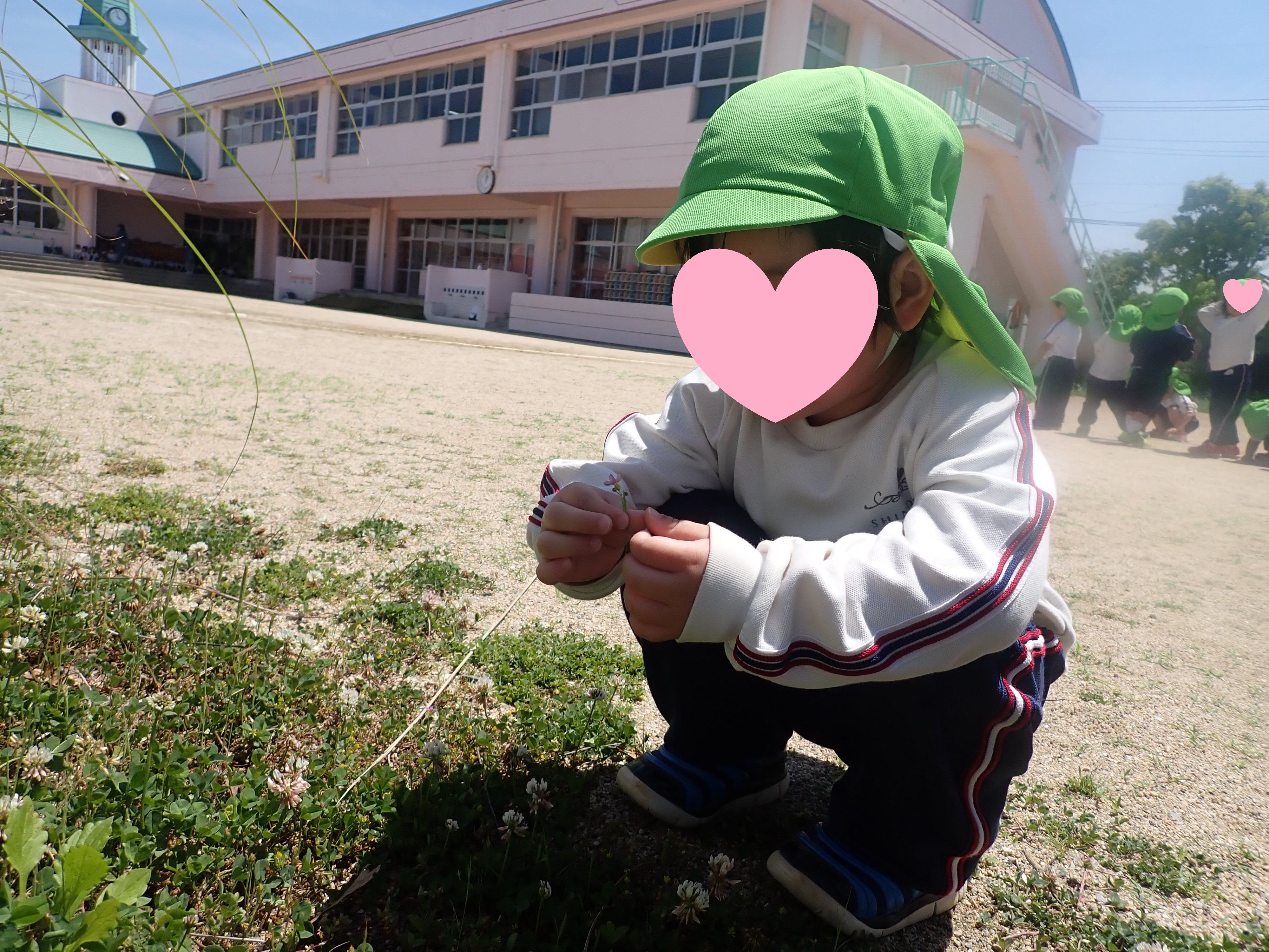 シロツメ草を見つけたUMちゃんは、指に挟んで指輪に見立て嬉しそうに保育者に見せに来てくれましたよ(≧▽≦)春ですね♡