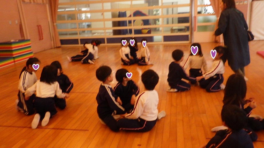 前にお友だち一人が出て動物の名前を言うと、その動物の名前の文字数と同じ人数が集まって座るゲームです!!