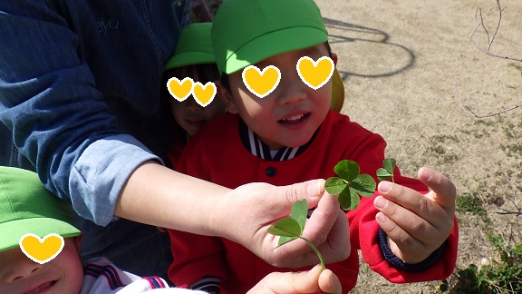 中当ての後、自由遊びをそれぞれ楽しみ、保育者が四つ葉のクローバーを見つけて「四つの葉があるクローバーはいいことがあるんだよ~」と話すと、子どもたちも一生懸命探していました☆