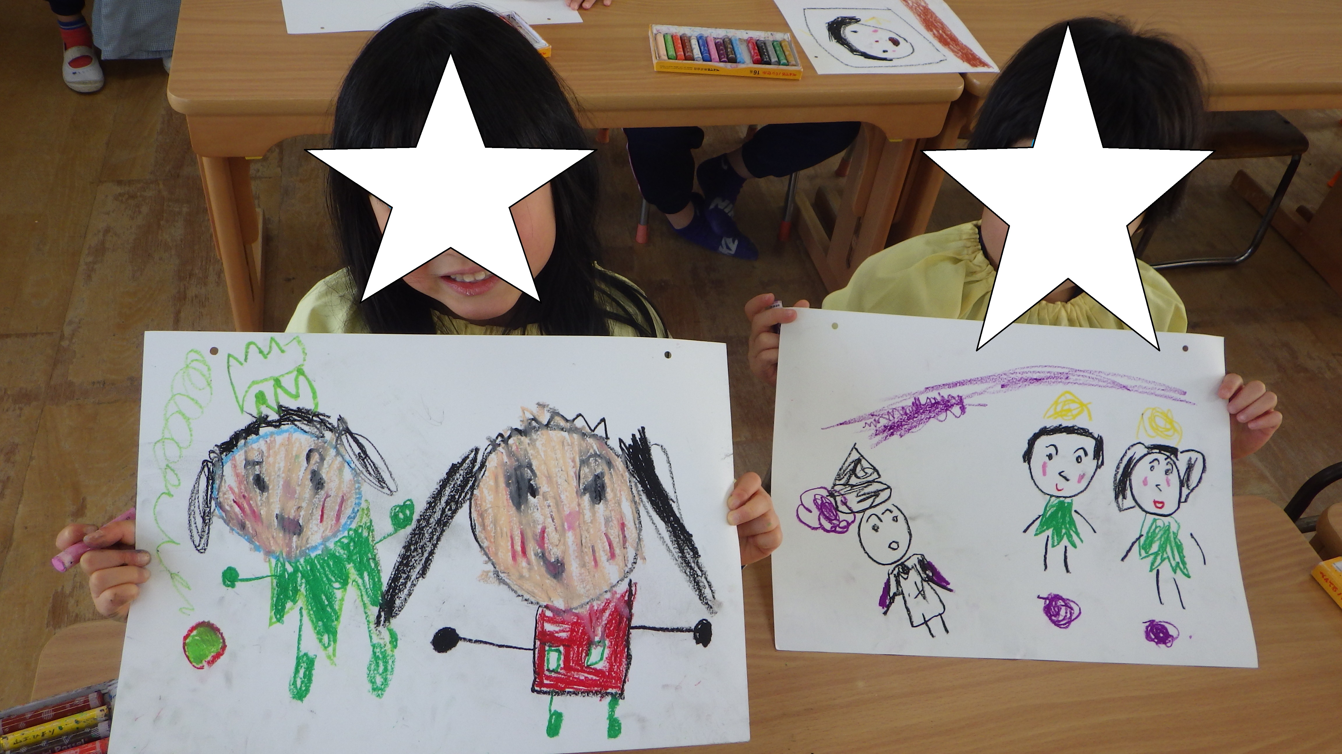 ”ジャックと豆の木”で自分が着た衣装の色まで表現していたり、楽器の音色を楽譜を描いて表現している子もいましたよ(∩´∀`)∩